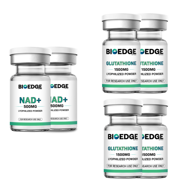 This multi-unit research supply contains separate lyophilized preparations of glutathione, a naturally occurring tripeptide, and nicotinamide adenine dinucleotide (NAD⁺), an oxidized redox-active dinucleotide coenzyme. Both compounds are supplied for laboratory research applications including redox chemistry studies, metabolic pathway analysis, and in vitro biochemical assay development.