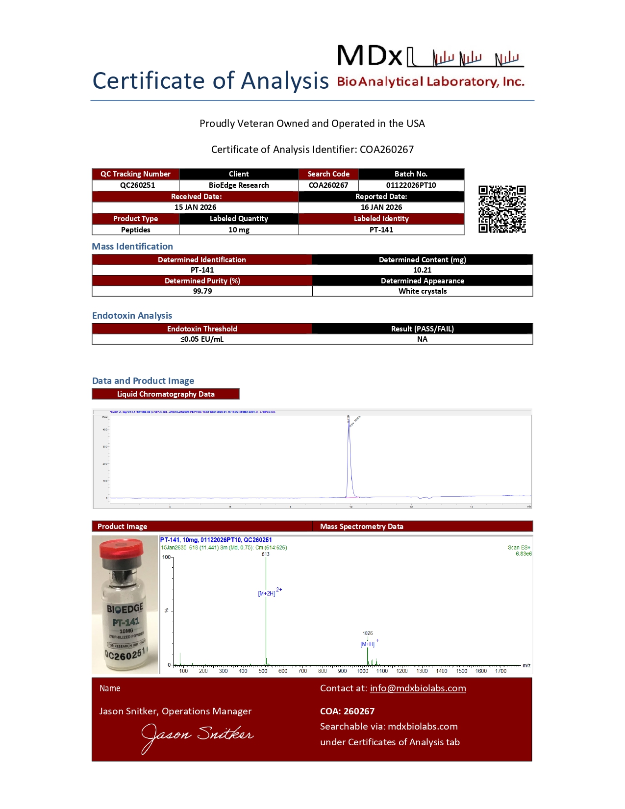 Every batch of BioEdge PT-141 undergoes independent third-party testing prior to release. Testing is performed by ISO-accredited laboratories with results available on each product page.