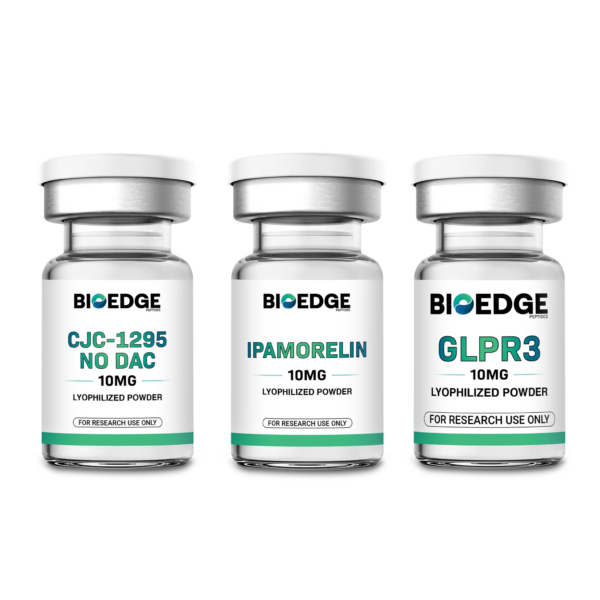 This multi-unit peptide supply contains separate lyophilized vials of GLPR3, CJC-1295 No DAC, and Ipamorelin. Each peptide is provided for laboratory research applications such as receptor binding studies, GPCR signaling pathway analysis, and analytical peptide characterization workflows.