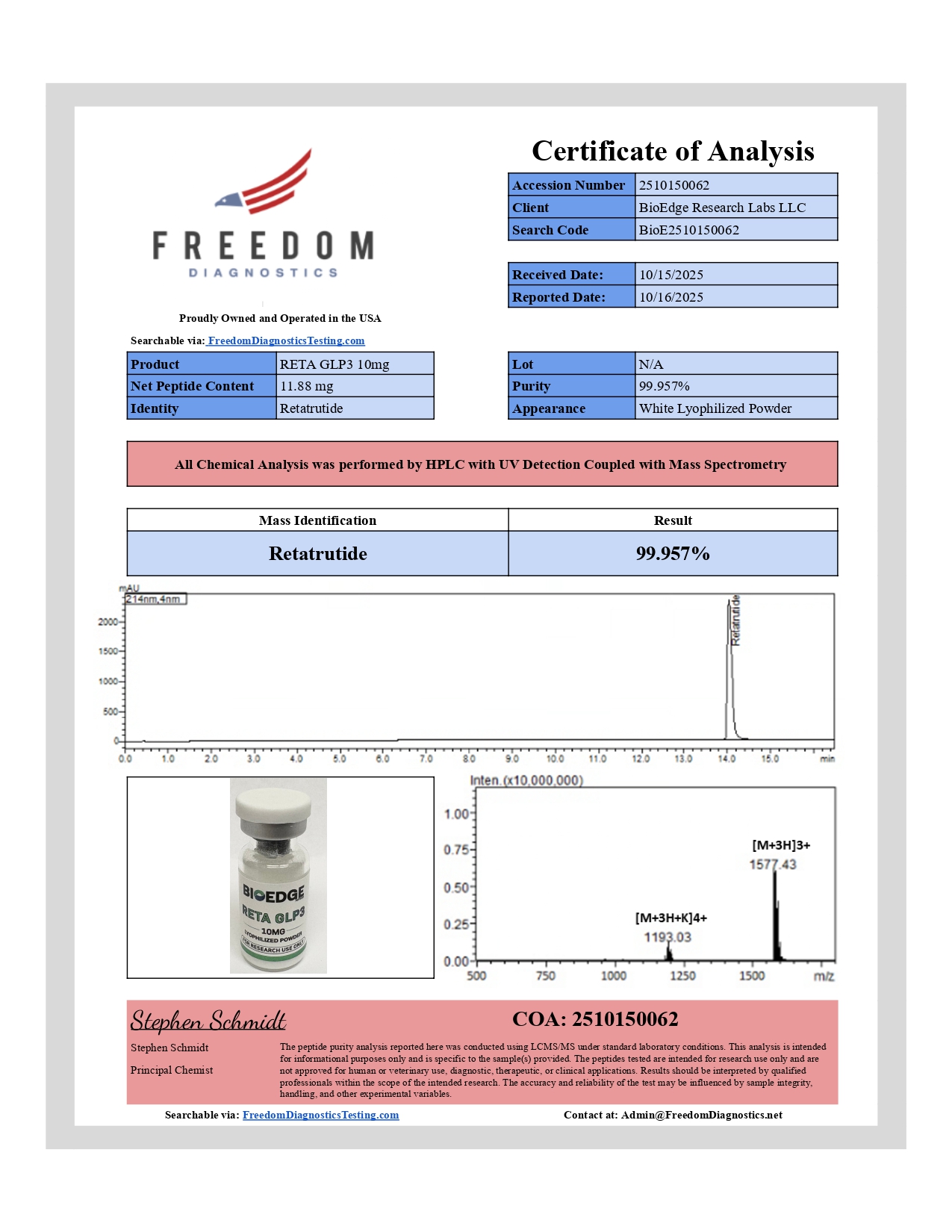 Retatrutide (R-GLP-3) is supplied by BioEdge Research Labs exclusively for laboratory testing and in vitro research.
